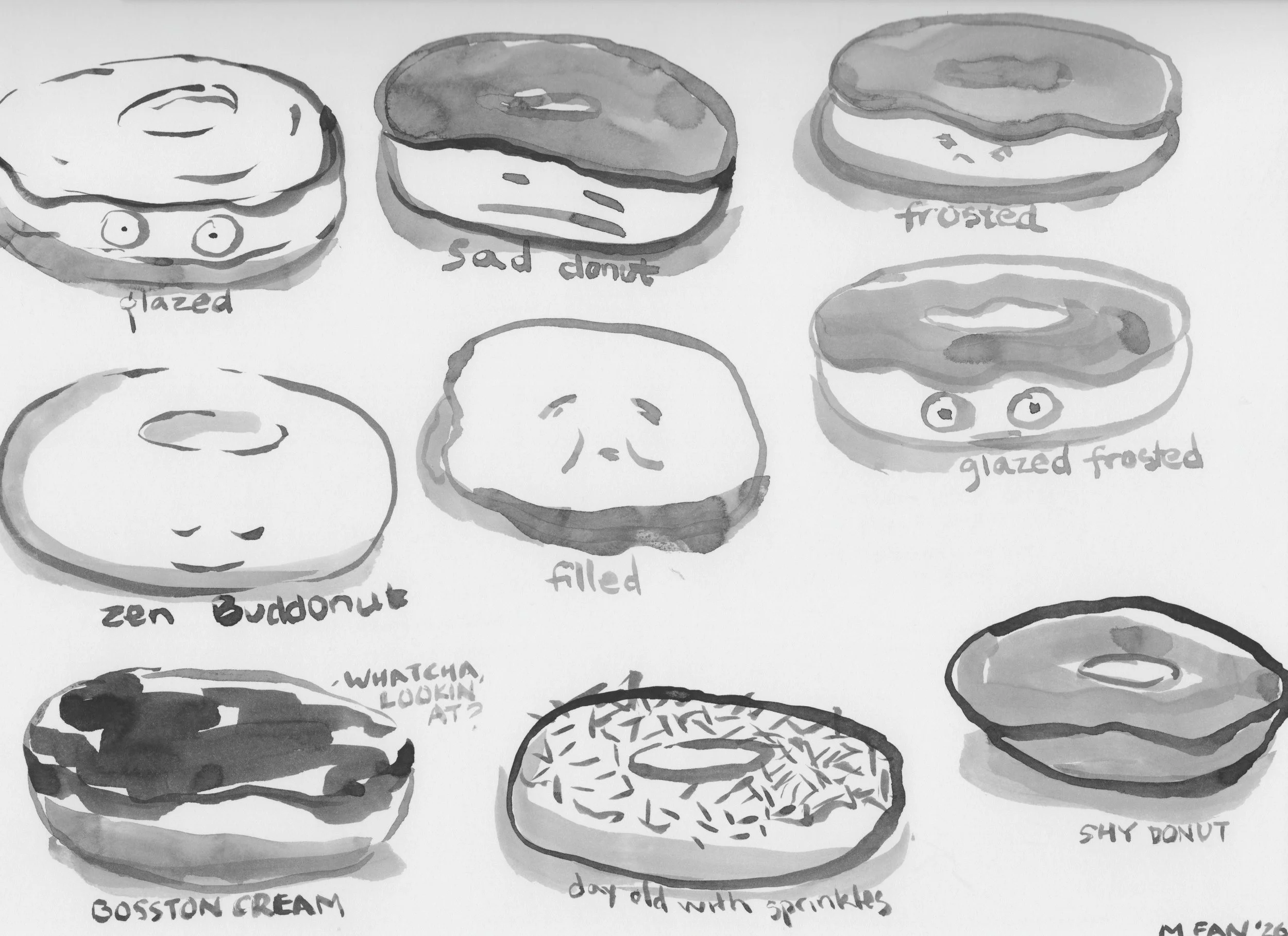 I don’t mean to typecast. I might not love all donuts equally, but I’m pretty sure I accept them all, (except for maybe the ones with bacon on them— I share that one with anyone who wants it). As I was drawing donuts, they just started to have personalities so I labeled them. It’s just a label, they can change their labels if they reach sentience.