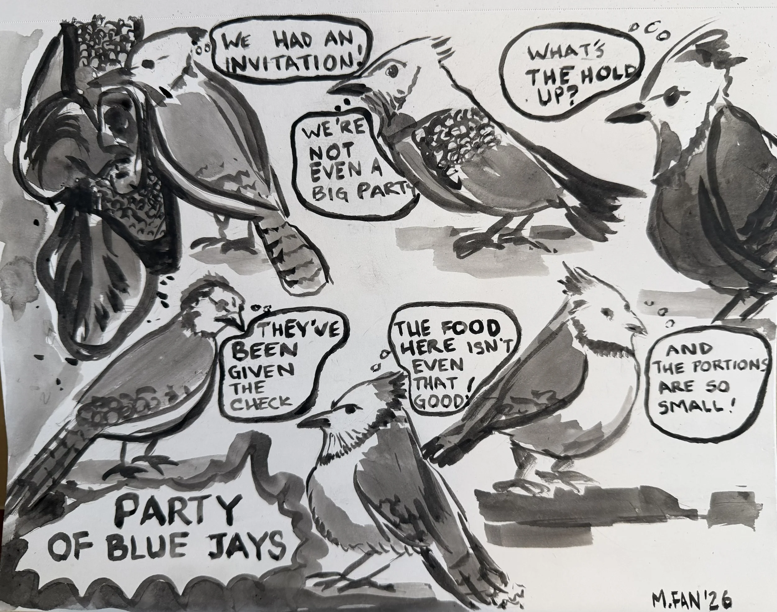 I love that Bluejays are related to crows. It makes them seem smarter and not just slightly complainy and pretty faces. A group of Bluejays is not called a murder, like crows, but a “Party” or “Band.” Does that make them the club or frat house birds? Some possible band names: Blurjays, Bubblejays, b-corvids, Winged Party, Party on the Wing… All dressed up and unable to be seated at the bird feeder.