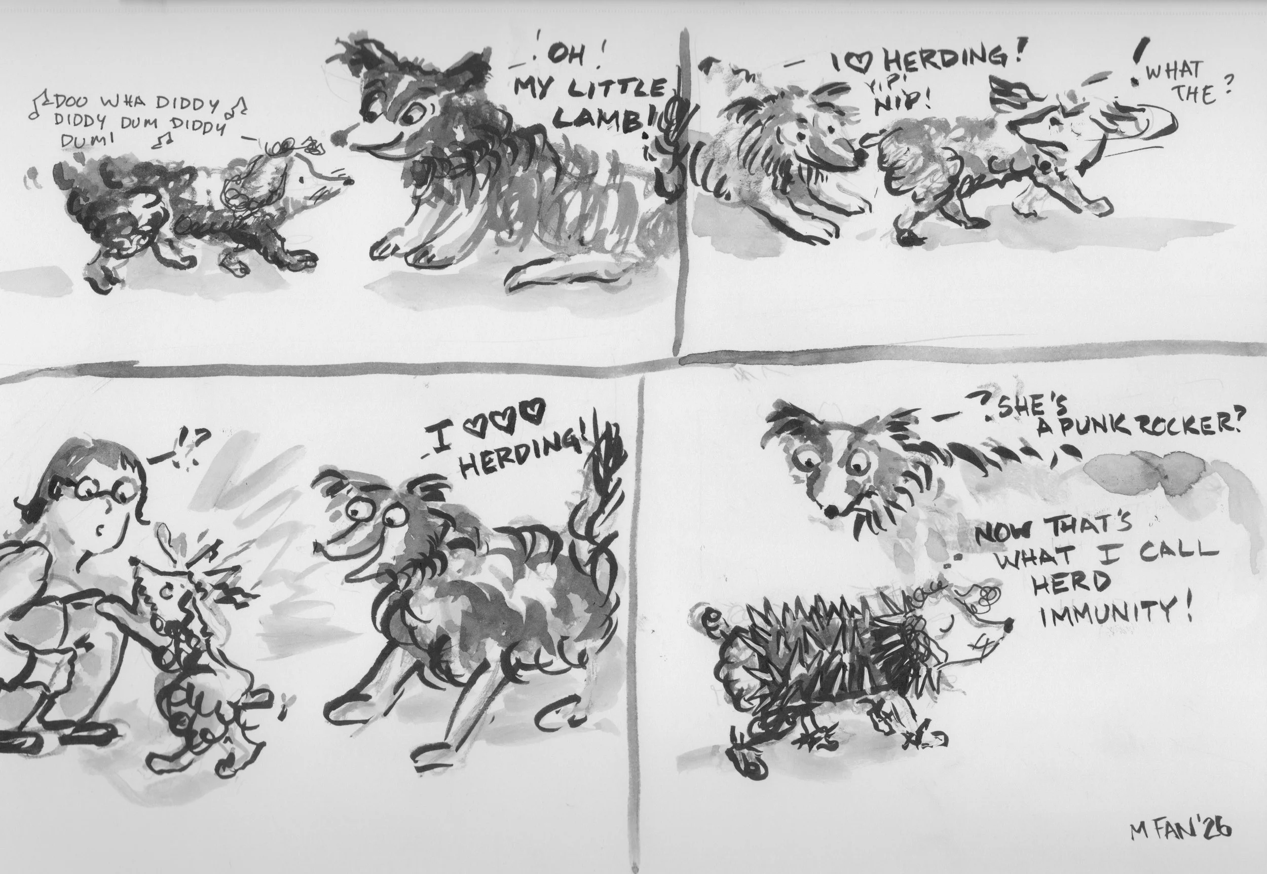 The foster border collie is a working dog without a job. About twice a day the very smart border collie decides to herd my little sheep-looking dog. The little dog looks plaintively at me. She’s upset by the affront to her dignity, autonomy, and tired of the gosh darn doggedness of her cousin.