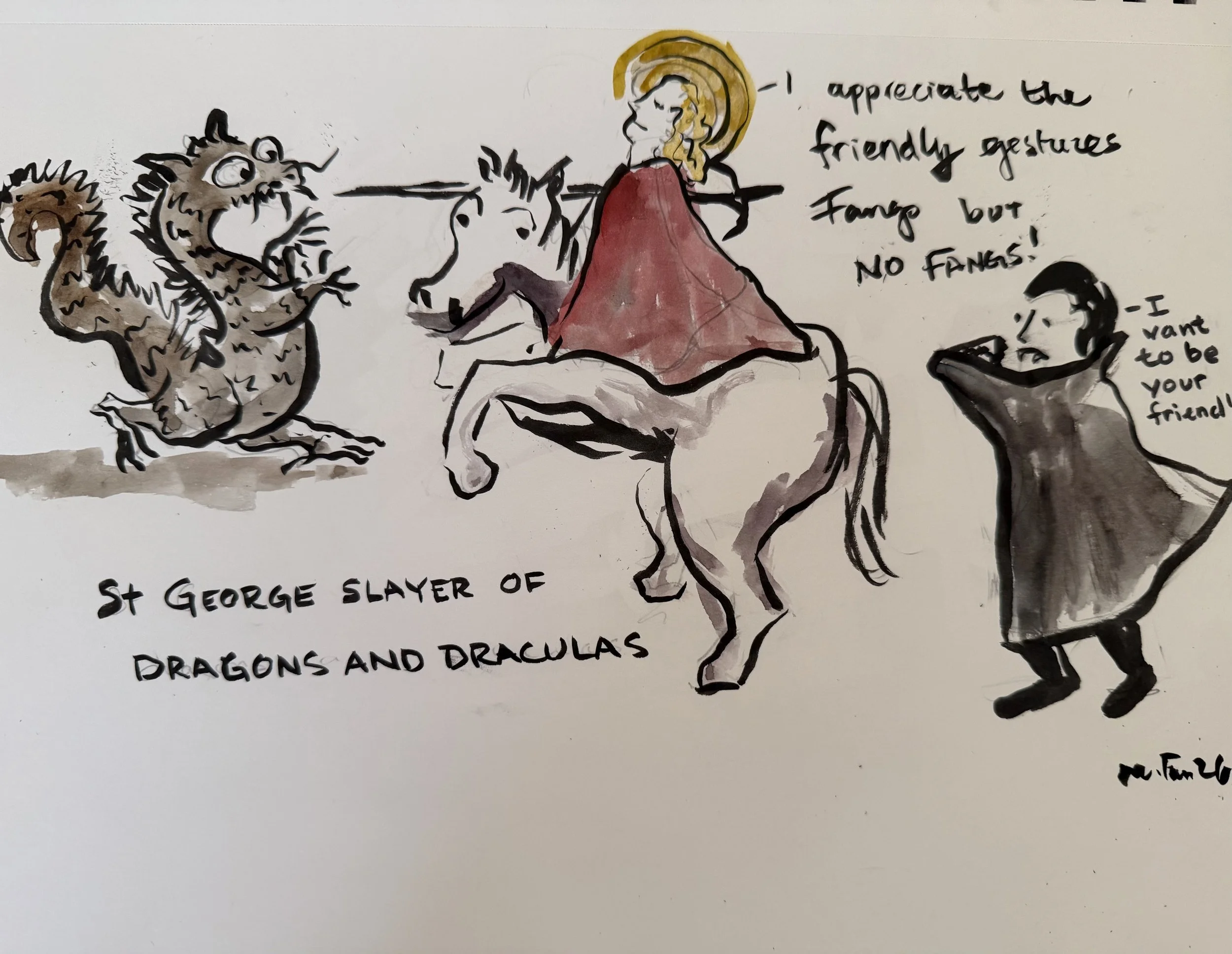 There’s plenty more, but disappointingly not much about dragons. This gem though: in Greece, he is venerated for keeping vampires at bay. By George!